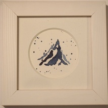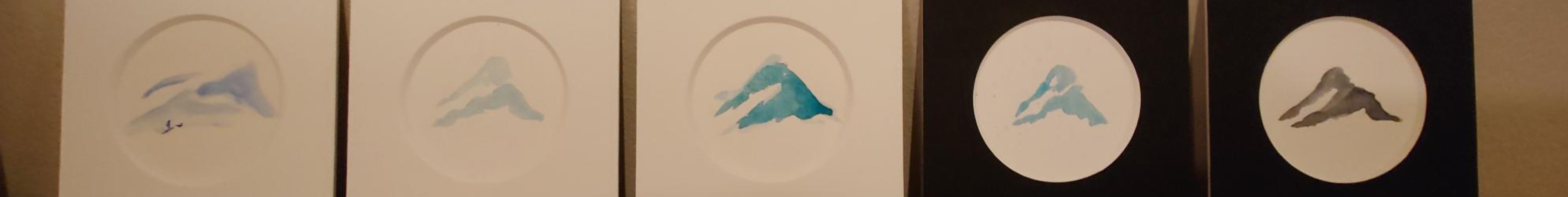 I denne eplabutikken selger jeg egenmalte fjellbilder med runde passepartout.