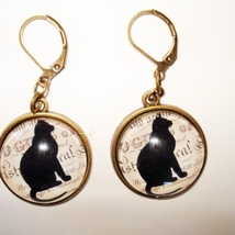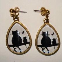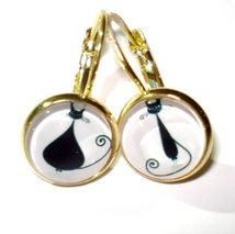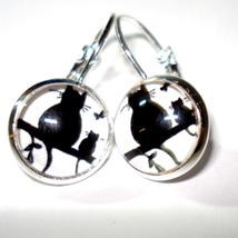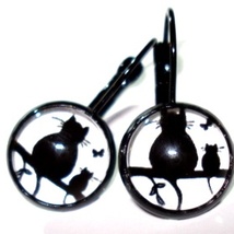 Ørering katte par tykk & tynn, Øredobber cabochon katter svart, øredobber sølv svart pus
