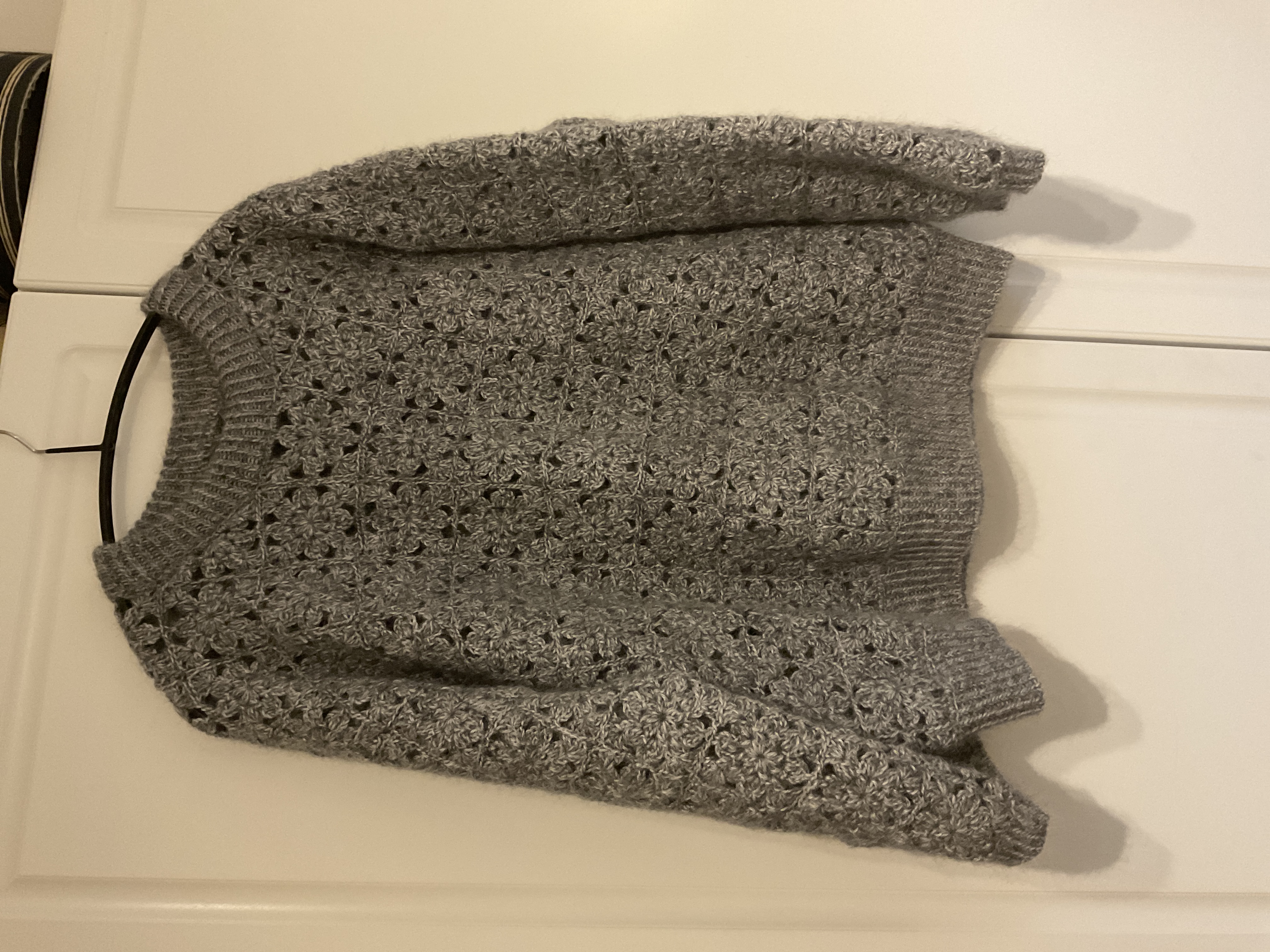 Heklet genser.Sandnes silk og silk alpakkaStr ca M57cm over brystet.Lengde 58cmFra håndledd til håndledd 145cmKr 3000.-