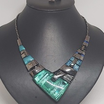 Disco, statement, halslenke med store, kraftige ledd i sjøgrønt, isblått og stålgrått