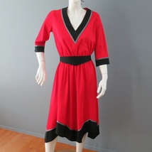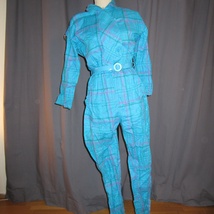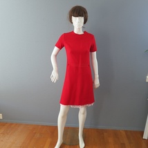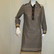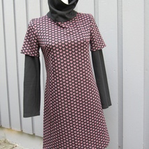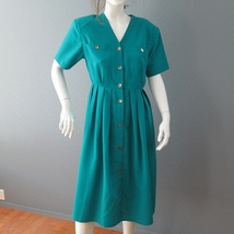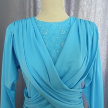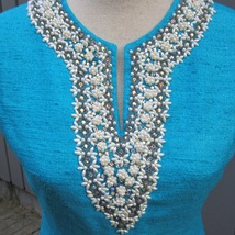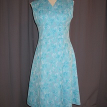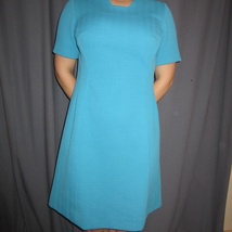 Vintage 60-talls kjole i turkis fiskebensmønstret materiale med stretch, str 42/44