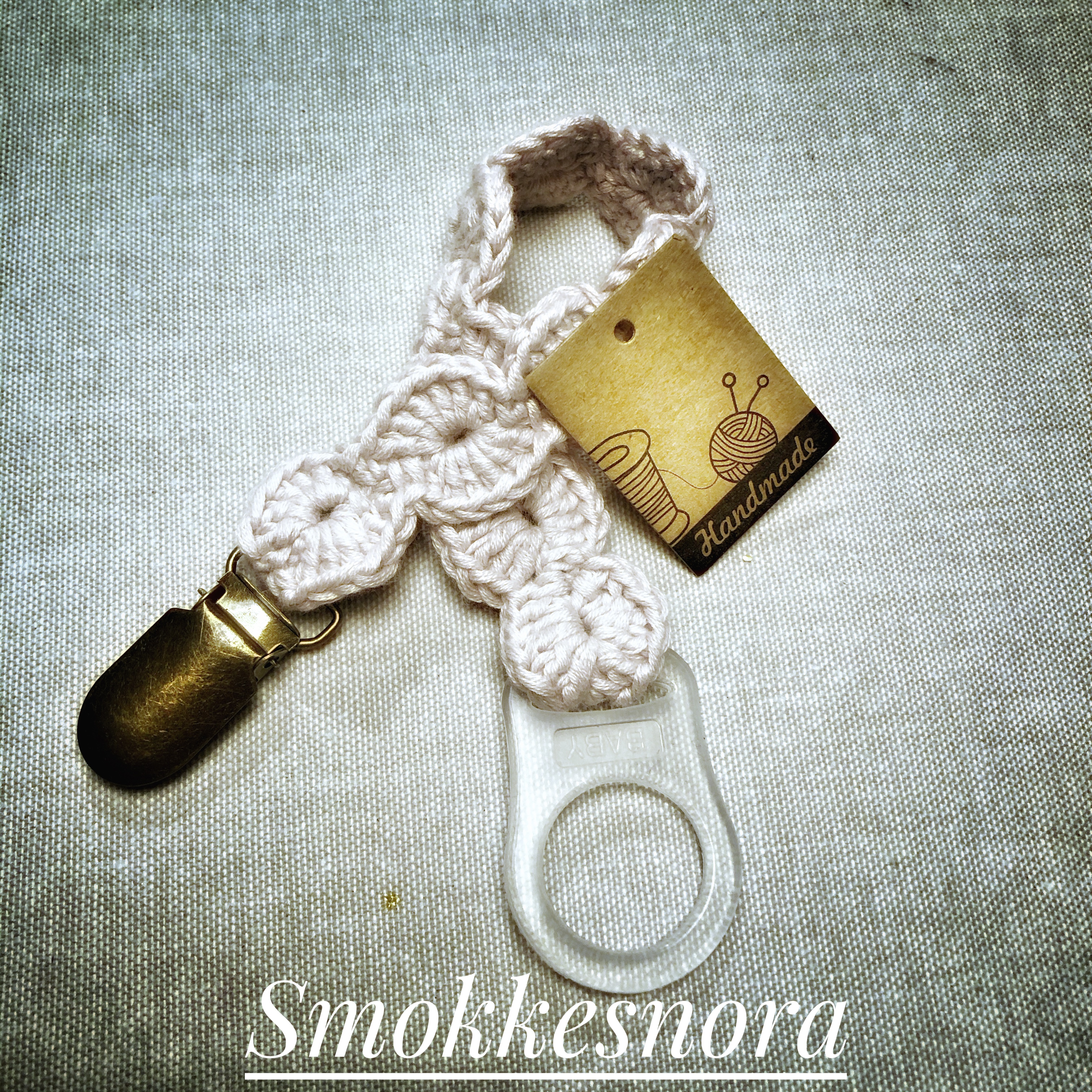 Søte smokkesnorer som er heklet i 100% bomull.Klypa kan tas av.Vask 60 grader.Leveres med søt, liten gaveeske.