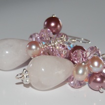 Rosa drøm. Dråper med sølv 925, rosenkvarts, swarovski, ferskvannsperler og glassperler.