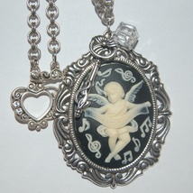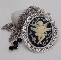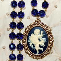 Blått kamésmykke med englemotiv i vintagestil