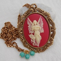 Nydelig rødfarget kamésmykke i vintagestil med swarovski kube og små grønne vintage plastperler