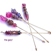 Sjalnål av bronse, med lampwork, gull og fuchsiafarget