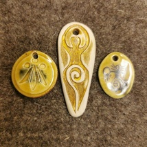 Samt keramiske anheng og perler. Noen av perlene er historiske etter gravfunn, andre er etter gravfunn men endret farge og størelse. Og så er det selvsagt de perlene som ikke er funnet enda.... (det er ofte slike moderne vikinger vil ha).