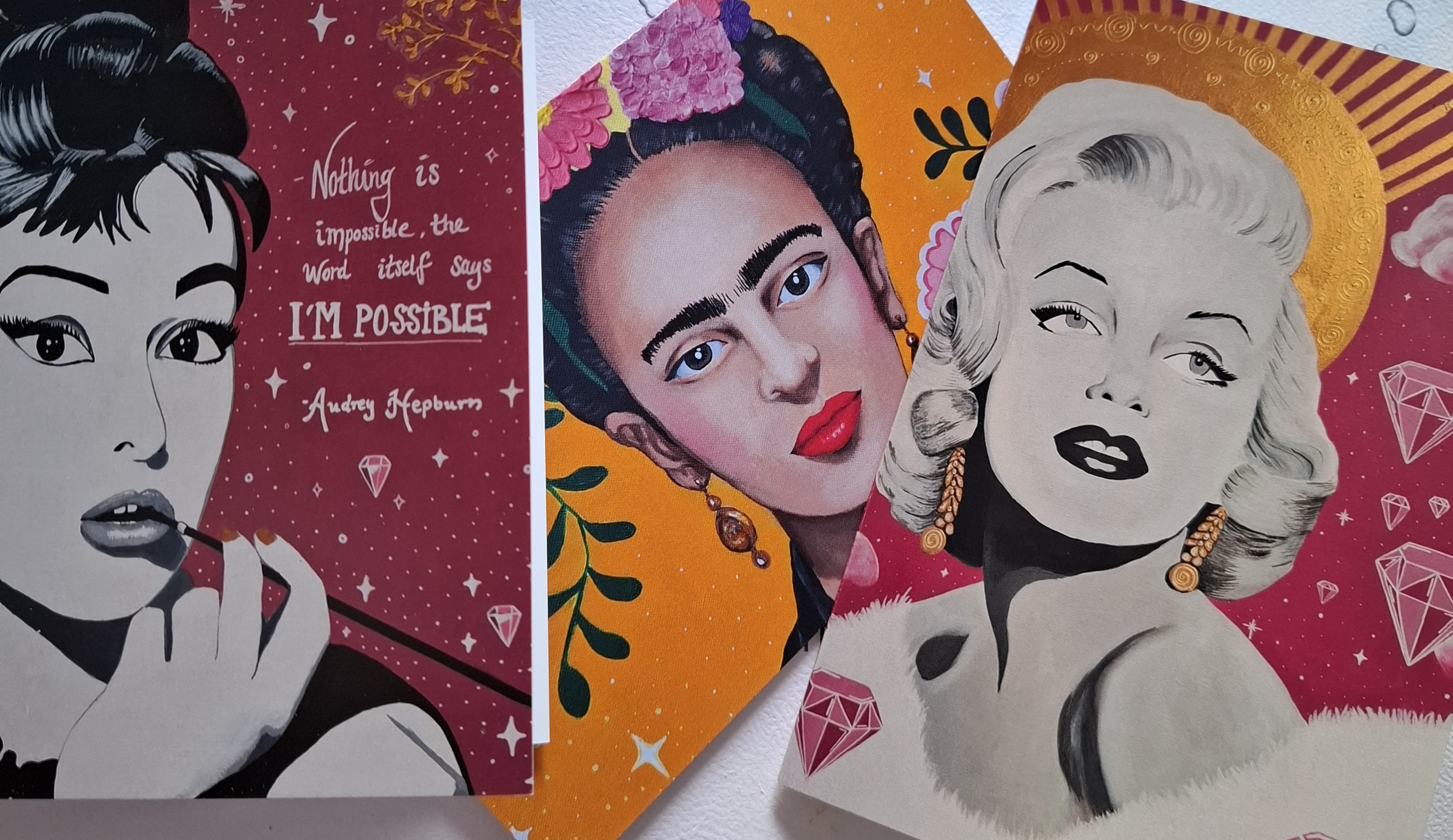 Her finnes kunst; akryl på lerret, print/ gicleer, håndlagede smykker med motiv fra egne malte bilder, øredobber, heklede vesker og grytekluter.