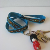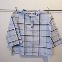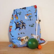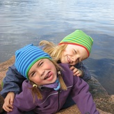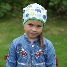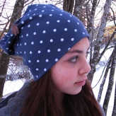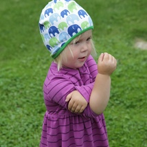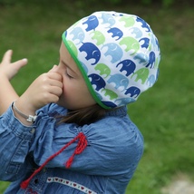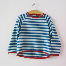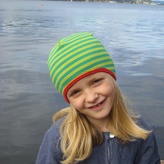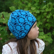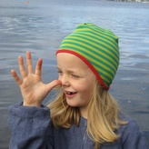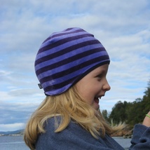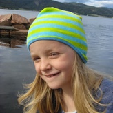 Blå og turkis stripete barnelue i jersey, str S (ca 1-2 år)
